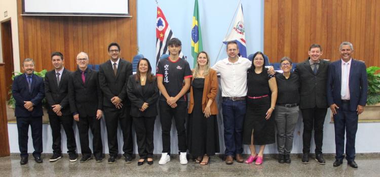 A Vereadora Franciele Cristina Villa Matos (PL) parabenizou, por meio da Moção de Aplausos nº 5/2026, o atleta Matheus Fernandes Ribeiro, por sua trajetória no karatê. A propositura foi aprovada por unanimidade nesta segunda-feira, dia 23 de fevereiro, na 1845ª Sessão Ordinária da Câmara Municipal de Jales. O homenageado estava presente na ocasião, acompanhado pelos pais.